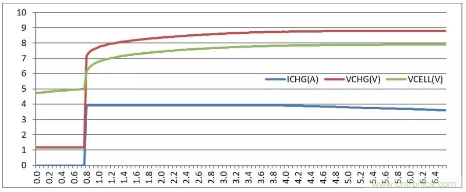基於這個管理過程,使用充電芯片BQ24725A對一塊對講機電池(滿充電壓8.8V)進行充電,並記錄下充電過程中的VCHG, ICHG和VCELL(電芯側的電壓)。下圖所示為基於橫坐標的充電時間(分鍾)對應的各個參數的變化趨勢,可以看到在不到第五分鍾,VCHG就達到最大值,ICHG就從峰值的4A電流開始下降,經曆了從CC區間到CV區間的切換。最大充電速率的CC階段4A充電持續時間很短,可以預料,如果要對這塊電池完全充滿,CV區間將耗費很長的時間。