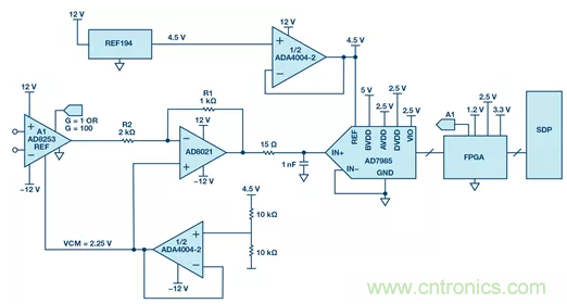 圖1中的電路顯示了帶有2.5MSPS和上遊可編程儀表放大器的16位SAR轉換器,它將增益設置為1或100。通過在FPGA中進行過采樣和數字信號處理,該電路可實現大於125dB的動態範圍,並且仍然非常安靜。高動態範圍是通過AD8253的自動切換和過采樣實現的,其中信號的采樣速率遠高於奈奎斯特頻率。