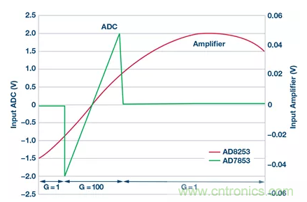 除模擬路徑中的組件外,FPGA(或處理器)對電路性能也很重要。關鍵任務是將儀表放大器的增益從1切換為100。為此,對許多閾值進行了編程以確保ADC不飽和。因此,AD8253在輸入電壓高達20mV左右時以100為增益運行,這使得ADC輸入端的最大電壓達2.0V。然後,FPGA將AD8253的增益降至1且沒有延遲,以防止過載(見圖3)。