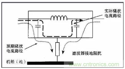 由you於yu接jie地di線xian較jiao長chang,在zai高gao頻pin時shi導dao線xian的de分fen布bu電dian感gan不bu能neng忽hu視shi。如ru果guo濾lv波bo器qi搭da接jie良liang好hao,幹gan擾rao信xin號hao可ke以yi通tong過guo殼ke體ti直zhi接jie接jie地di。如ru果guo濾lv波bo器qi的de殼ke體ti和he機ji箱xiang之zhi間jian搭da接jie不bu良liang,相xiang當dang於yu濾lv波bo器qi的de殼ke體ti(地)與yu機ji箱xiang之zhi間jian存cun在zai一yi個ge分fen布bu電dian容rong,這zhe將jiang導dao致zhi濾lv波bo器qi高gao頻pin時shi接jie地di阻zu抗kang較jiao大da,尤you其qi在zai分fen布bu電dian感gan和he分fen布bu電dian容rong諧xie振zhen的de頻pin率lv附fu近jin,接jie地di阻zu抗kang趨qu於yu無wu窮qiong。