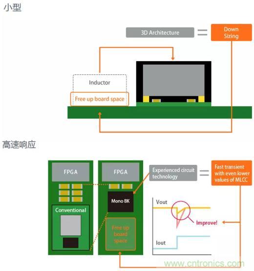 【導讀】除了產品,包括外置元件在內,村田還設計了尺寸小、噪聲低的DC-DC轉換器模塊MonoBK or Mono Block解決方案。村田的MonoBK解決裝置的空間問題。