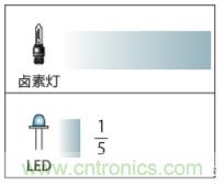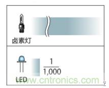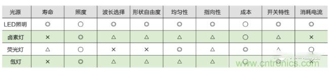 其中鹵素燈、熒光燈、氙燈都是我們常見的光源類型,鹵素燈又是這些裏最常見的。那我們就看一下LED對比鹵素燈的: