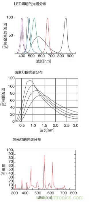 當然就算你的響應速度再快、消耗電流更小、壽命更長但如果光譜分布不好也是有問題的,所以下麵我們看一下LED的顏色光譜分布情況。首先要說明LED照明的光譜分布不像熒光燈、鹵素燈那樣波長分布較寬,每個LED照明發光波長可謂某個固定的特定波長。