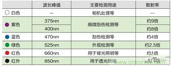 比(bi)紅(hong)光(guang)的(de)散(san)射(she)率(lv)作(zuo)為(wei)基(ji)準(zhun)單(dan)位(wei),各(ge)波(bo)長(chang)相(xiang)對(dui)於(yu)紅(hong)光(guang)的(de)散(san)射(she)率(lv)比(bi)值(zhi)。波(bo)長(chang)越(yue)短(duan)散(san)射(she)率(lv)越(yue)高(gao)。使(shi)用(yong)散(san)射(she)率(lv)較(jiao)高(gao)的(de)波(bo)長(chang)時(shi),便(bian)於(yu)捕(bu)獲(huo)檢(jian)測(ce)物(wu)體(ti)表(biao)麵(mian)的(de)散(san)射(she)光(guang),有(you)效(xiao)檢(jian)測(ce)散(san)射(she)光(guang)反(fan)映(ying)出(chu)的(de)表(biao)麵(mian)特(te)征(zheng)。反(fan)之(zhi),波(bo)長(chang)變(bian)長(chang)時(shi)透(tou)光(guang)率(lv)也(ye)隨(sui)著(zhe)增(zeng)大(da),特(te)別(bie)是(shi)紅(hong)外(wai)光(guang)照(zhao)明(ming),常(chang)用(yong)於(yu)背(bei)光(guang)光(guang)源(yuan)檢(jian)測(ce)透(tou)過(guo)檢(jian)測(ce)物(wu)體(ti)的(de)折(zhe)射(she)光(guang)。