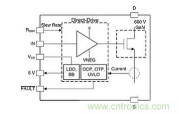 eGaN 價格降低使芯片製造商能夠解決這兩個問題。例如,Texas Instruments 在其 LMG3411R070 的集成柵極驅動中集成了70 毫歐姆 (mΩ)、600 伏 eGaN 功率級(圖 2)。