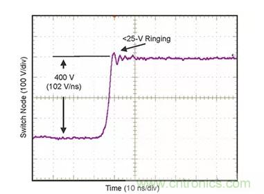 該芯片的壓擺率可達 100 伏/納秒 (ns) 且瞬時振蕩近乎為零(圖 3)。相比之下,傳統矽功率 MOSFET 的壓擺率典型值為 3 至10 V/ns。