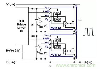 圖4:如圖所示,Navitas 的 NV6113 可並行部署,用於半橋拓撲結構。(圖片來源:Navitas Semiconductor)