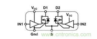 圖5:EPC 的 eGaN 集成驅動器 IC 包含兩個功率晶體管,各配有相應的優化型柵極驅動器。(圖片來源:EPC)