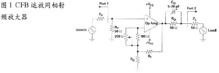 CFB運yun放fang射she頻pin放fang大da器qi的de基ji本ben拓tuo撲pu仍reng是shi反fan饋kui放fang大da器qi結jie構gou,有you同tong相xiang放fang大da器qi和he反fan相xiang放fang大da器qi兩liang種zhong形xing式shi。另ling一yi方fang麵mian,對dui射she頻pin電dian路lu而er言yan,要yao特te別bie關guan注zhu輸shu入ru端duan與yu輸shu出chu端duan的de阻zu抗kang匹pi配pei問wen題ti,係xi統tong常chang用yong50Ω電纜連接,由於運放的輸入阻抗高,因而輸入端並接一個50Ω電阻;在輸出端,運放輸出阻抗低,故而串接了一個50Ω電阻。這樣,同相放大器就如圖1所示。