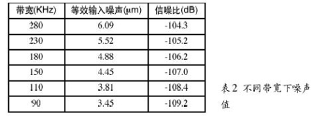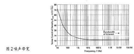 噪聲值—當運放作為有源器件時,RF噪聲值與運放噪聲是一回事。熱噪聲有一定影響,但RF電路使用的電阻通常較小,它們的噪聲可忽略不計。運放RF電路的噪聲與增益和帶寬有關。例如,使用一個運放,應用於10.7MHz中放,信號電平0dBV,增益為1,噪聲譜密度如圖2所示。此外,帶寬越窄,噪聲越低,見表2。