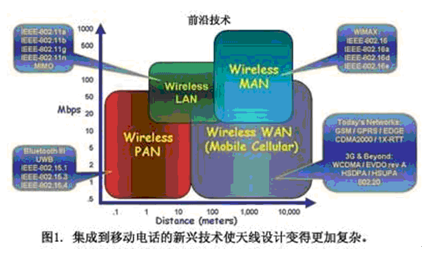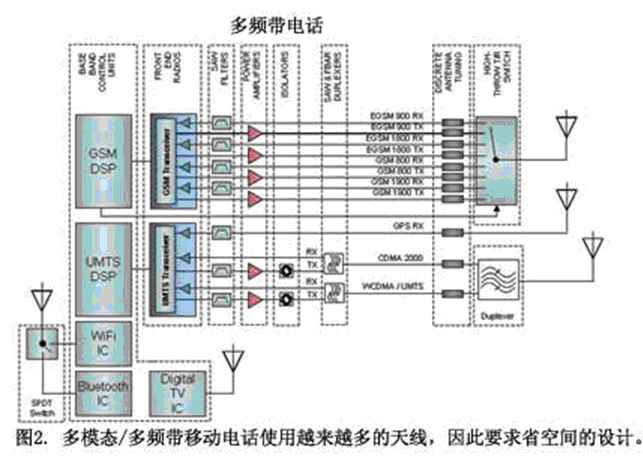 當一個天線發送不想要的信號(不論何種頻率)時(shi),就(jiu)會(hui)發(fa)生(sheng)幹(gan)擾(rao),但(dan)不(bu)管(guan)怎(zen)樣(yang)仍(reng)然(ran)會(hui)被(bei)另(ling)一(yi)個(ge)天(tian)線(xian)接(jie)收(shou)。當(dang)移(yi)動(dong)電(dian)話(hua)相(xiang)互(hu)靠(kao)近(jin)時(shi)就(jiu)會(hui)發(fa)生(sheng)幹(gan)擾(rao),移(yi)動(dong)電(dian)話(hua)設(she)計(ji)者(zhe)早(zao)就(jiu)觀(guan)察(cha)到(dao)這(zhe)個(ge)現(xian)象(xiang),並(bing)且(qie)采(cai)用(yong)多(duo)種(zhong)電(dian)路(lu)與(yu)控(kong)製(zhi)技(ji)術(shu)來(lai)解(jie)決(jue)幹(gan)擾(rao)問(wen)題(ti)。直(zhi)到(dao)最(zui)近(jin),電(dian)話(hua)在(zai)進(jin)行(xing)蜂(feng)窩(wo)通(tong)話(hua)時(shi)隻(zhi)使(shi)用(yong)一(yi)個(ge)天(tian)線(xian),也(ye)許(xu)還(hai)有(you)第(di)二(er)個(ge)天(tian)線(xian)用(yong)於(yu)藍(lan)牙(ya),而(er)現(xian)在(zai)則(ze)可(ke)能(neng)有(you)第(di)三(san)個(ge)用(yong)於(yu)GPS。這些多功能蜂窩電話通常帶有與藍牙和GPS天線隔離的蜂窩天線。隨著新標準和其它特性的出現(圖2),蜂窩電話攜載寬帶,甚至包括CDMA和GSM等競爭技術變得很有必要。再加上藍牙、WiFi和很快將被采用的WiMAX,移動電話設計者所麵對的移動終端上會包含越來越多的天線。隨著UWB和MIMO收發器等個人和局域網技術的長足進步,蜂窩電話開發者已經意識到嚴重的幹擾問題在等著他們。