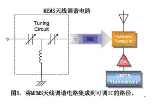 天線調諧器件的一種應用方法是采用一個諧振或阻抗可調(RLC)電路,以使可變電容能夠調節功率放大器和天線之間的複雜阻抗。基本的方法如圖5所示,其中通過RF-MEMS技術將可調電容和精確電感集成到一起。