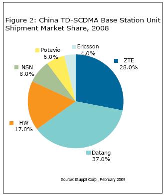 大唐以每載波頻率不到4000美元的最低價獲得了中國移動TD-SCDMA合同的最大份額。大唐目前在該合同中的市場份額達37%,中興和華為分別以28%與17%居其後。
