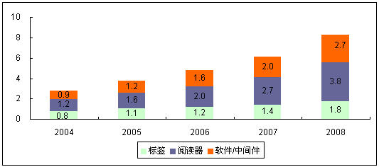 RFID在中國起步較晚,但受益於中國二代身份證市場的強勁需求,市場出現了短期大規模的井噴增長。2004~2007年,中國RFID整體市場規模急速增長,到2008年隨著中國二代身份證市場的成熟,中國RFID整體市場銷售額出現下滑。