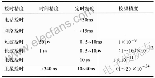 衛星授時GPS導航係統:提供的時間信號對世界協調時跟蹤,精度優於100ns。GPS全球覆蓋,接收設備體積小,可以接收6顆衛星信號,可用來提供2.048Mbit/s基準時間信號。俄羅斯的GLONASS衛星導航係統:目前係統未完成完善,接收設備商業化不夠。中國的北鬥導航係統:精度達到50ns,目前覆蓋中國,同步衛星信號接收設備體積較大,係統還未建成。(3)網絡授時:通過互聯網授時。使用NTP(NetworkTimeProtocol,網絡時間協議,RFC1305)。(4)電話授時:通過公共電話網,用戶用調製解調器接首時間信號。(5)電視授時:通過電視網授時。(6)電信有線傳輸網授時表1是授時精度比較表1