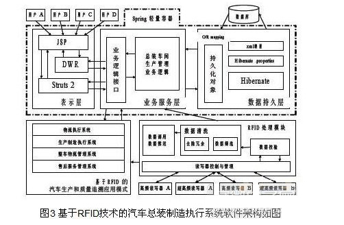 本係統采用B/S架構,在J2EE開發環境下,結合Struts2、Hibernate、Spring、DWR等主流開源框架,具有良好的跨平台兼容性。基於RFID技術的汽車總裝管理係統的軟件架構如圖3所示: