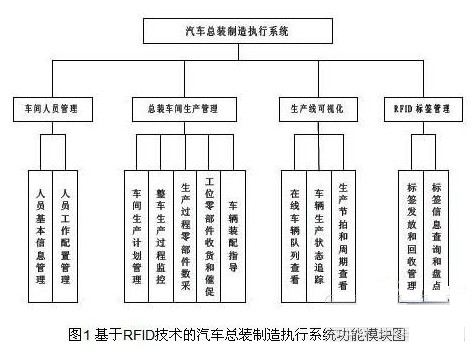 基於RFID技術的汽車總裝製造執行係統功能模塊主要分為車間生產管理、生產線可視化、RFID標簽管理、車間人員管理等四個功能模塊,具體功能結構如圖1 所示: