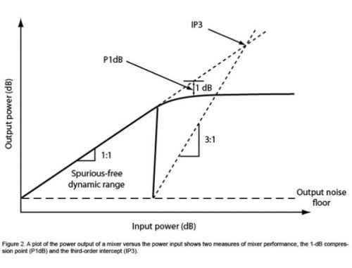 由於未能達到實際的IP3點,因此IP3點是從IMD3獲得的理論值。混頻器的輸出級在達到IP3之前飽和。一般對於無源混頻器而言,高頻信號的IP3至少為P1dB以上15 dB,低頻信號的IP3至少為壓縮點以上10dB。