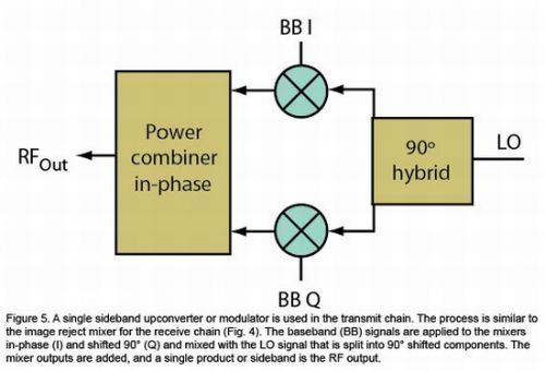圖5:單邊帶上變頻器或調製器用於發射信號鏈中。此過程類似於接收信號鏈的鏡像抑製混頻器(圖4)。基帶(BB)信號被施加到同相(I)和90°相移(Q)混頻器,並與分成90°相移分量的LO信號進行混頻。增加了混頻器輸出,單個產物或邊帶為RF輸出。