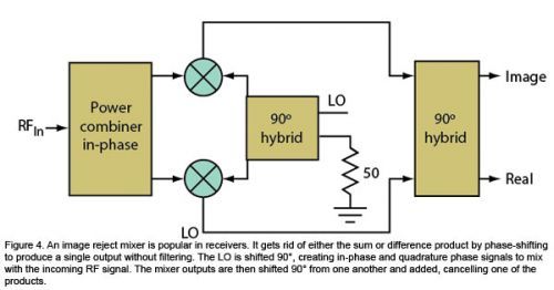 圖4:鏡像抑製混頻器在接收器中最受歡迎。它可以通過相移去掉和頻或差頻產物,產生單個輸出,而不需要濾波。LO進行90°相移,產生同相和正交相位信號,與輸入的RF信號進行混頻。然後混頻器輸出互相進行90°相移,從而去掉部分產物。