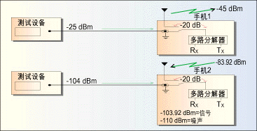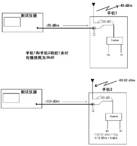 多數情況下,手機會因屏蔽很差的RF電纜或未連接的天線端口很容易受到噪聲影響。一般來講天線端口是噪聲的主要來源,特別是如果天線是在測試時才接上。圖3表示正在進行靈敏度試驗的手機對另一個正向鏈路功率-25dBm手機可能產生的影響情況,手機1是正在進行測試的手機,具有較高的-25dBm正向鏈路功率。由於手機1發射信道功率為-25dBm,假設未連接開關的衰減是20dB,那麼通過天線未連接端口泄露出的信號可能高達-45dBm。