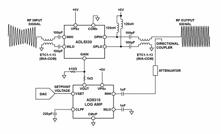 圖1:ADL5330與AD8318配合在自動增益控製環路中工作