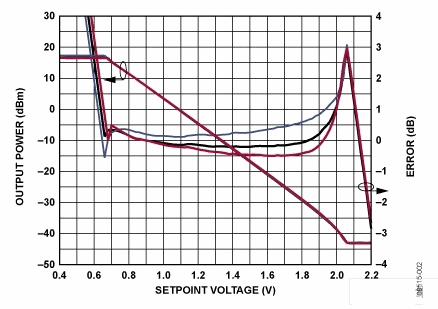 圖2:ADL5330輸出功率與AD8318設定點電壓關係曲線,PIN = -1.5 dBm
