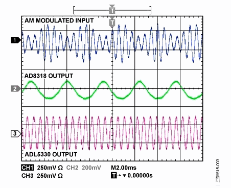 為使AGC環路保持均衡,AD8318必須跟蹤ADL5330輸出信號的包絡,並向ADL5330的增益控製輸入提供必要的電平。圖3所示為圖1中 AGC環路的示波器屏幕截圖。將采用50% AM調製的100 MHz正弦波施加於ADL5330。ADL5330的輸出信號為恒定的包絡正弦波,其振幅與AD8318的設定點電壓1.5 V相對應。圖中還顯示了AD8318對不斷變化的輸入包絡的增益控製響應。