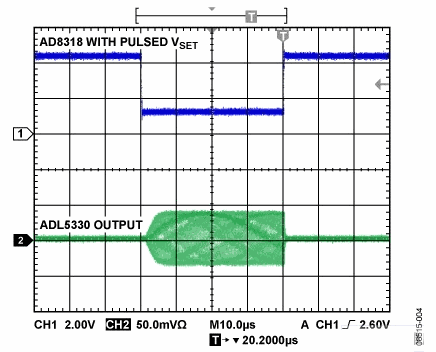 圖4顯示AGC RF輸出對VSET脈衝的響應。當VSET降至1 V時,AGC環路以RF突發脈衝予以響應。響應時間和信號積分量由AD8318 CFLT引腳上的電容控製,這與積分放大器周圍的反饋電容類似。電容增加將導致響應速度變慢。