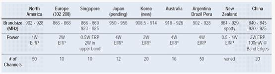 圖2:EPC Class1 G2的900MHz UHF 頻段範圍在各國的分配情況不一。