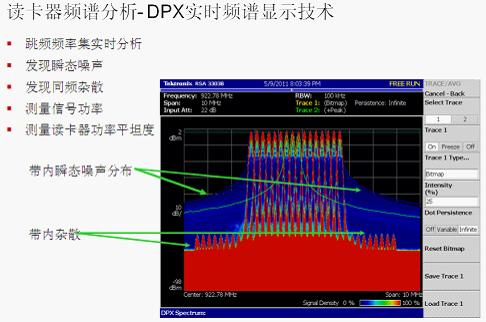 圖4:泰克RTSA集成的DPX實時頻譜顯示技術非常適合RFID的讀寫器頻譜分析。
