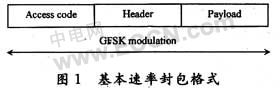 藍牙v1.2基帶數據封包中包含了存取碼、標頭、保護時段(guard band)和負載(payload),如圖1所示。基本速率調變指的是GFSK,數據會以每個符號攜帶一個位元的方式,在1 Mb/s的資料速率下進行傳輸,因此符號速率為1 Ms/s。資料會利用最小115 kHz的載波頻率中的位移或偏差,在RF載波上調變。高斯脈衝波形將-20 dB的頻寬維持1 MHz,頻譜利用率比BFSK高一倍。