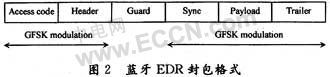 藍牙v2.0 EDR封包先在存取碼和標頭的部分使用GFSK調變模式,但是,在保護時間5μs之後,負載部分則用π/4-DQPSK或8DPSK調變模式,如圖2所示。在保持指定的1 Ms/s符號速率前提下,增強速率分別提升資料速率到2 Mb/s或3 Mb/s,即每個符號發射二到三位碼元。通過測試發現結果,在封包的GFSK調變部分振幅顯得相當固定,但在DPSK調變波形中振幅卻有較大的波動。