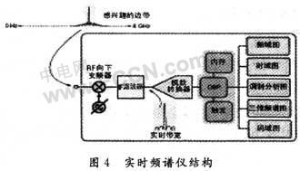 隨sui著zhe數shu字zi射she頻pin技ji術shu的de發fa展zhan,要yao求qiu必bi須xu能neng捕bu獲huo並bing存cun儲chu一yi段duan時shi間jian的de信xin號hao,並bing可ke反fan複fu回hui放fang,分fen析xi信xin號hao隨sui時shi間jian的de變bian化hua。另ling外wai,隨sui著zhe頻pin譜pu利li用yong率lv不bu斷duan提ti高gao,幹gan擾rao將jiang來lai自zi更geng臨lin近jin的de頻pin點dian,甚shen至zhi同tong一yi頻pin率lv,這zhe要yao求qiu頻pin譜pu測ce試shi技ji術shu在zai發fa現xian和he捕bu獲huo能neng力li上shang實shi現xian本ben質zhi性xing的de突tu破po。實shi時shi頻pin譜pu儀yi的de核he心xin是shi基ji於yu快kuai速su傅fu裏li葉ye(FFT)的儀表,可以實時捕獲各種瞬態信號,同時在時域、頻域及調製域對信號進行全麵分析,滿足現代數字射頻信號測試的需求,圖4所示為簡化的實時頻譜儀結構圖。