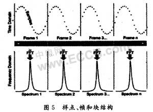 使用實時頻譜儀實時采集無縫捕獲信號時,三個條件(樣點、幀和塊)描述了存儲的數據層級。時域采集的信號通過FFT變bian換huan轉zhuan變bian到dao頻pin域yu,當dang處chu理li速su度du足zu夠gou快kuai時shi就jiu可ke以yi做zuo到dao實shi時shi處chu理li。數shu據ju層ceng級ji的de最zui低di層ceng是shi樣yang點dian,它ta代dai表biao著zhe離li散san的de時shi域yu數shu據ju點dian。幀zhen由you整zheng數shu個ge連lian續xu樣yang點dian組zu成cheng,是shi可ke以yi應ying用yong快kuai速su傅fu裏li葉ye變bian換huan把ba時shi域yu數shu據ju轉zhuan換huan到dao頻pin域yu中zhong的de基ji本ben單dan位wei。在zai這zhe一yi過guo程cheng中zhong,每mei個ge幀zhen產chan生sheng一yi個ge頻pin域yu頻pin譜pu。采cai集ji層ceng級ji的de最zui高gao層ceng是shi塊kuai,它ta由you不bu同tong時shi間jian內nei無wu縫feng捕bu獲huo的de許xu多duo相xiang鄰lin幀zhen組zu成cheng,如ru圖tu5所示。塊長度(也稱為采集長度)是一個連續采集表示的總時間。對塊內部的所有幀,每個采集在時間上都是無縫的,但在塊之間不是無縫的。