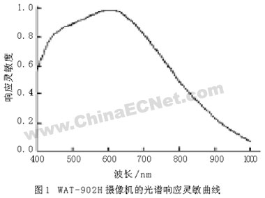 獲huo得de的de圖tu像xiang質zhi量liang直zhi接jie影ying響xiang圖tu像xiang處chu理li程cheng序xu的de複fu雜za度du和he檢jian測ce結jie果guo。如ru果guo采cai用yong的de光guang源yuan單dan色se性xing越yue好hao,越yue接jie近jin平ping行xing光guang,則ze圖tu片pian的de幹gan涉she條tiao紋wen更geng清qing晰xi,質zhi量liang更geng好hao。然ran而er單dan色se激ji光guang器qi或huo者zhe平ping行xing光guang源yuan體ti積ji大da,而er紅hong外wai測ce試shi係xi統tong的de一yi大da特te點dian就jiu是shi結jie構gou簡jian單dan、緊(jin)湊(cou),而(er)提(ti)供(gong)窄(zhai)波(bo)段(duan)的(de)照(zhao)明(ming)價(jia)格(ge)比(bi)較(jiao)昂(ang)貴(gui),且(qie)不(bu)易(yi)控(kong)製(zhi),因(yin)此(ci)選(xuan)用(yong)普(pu)通(tong)的(de)白(bai)熾(chi)燈(deng)作(zuo)為(wei)光(guang)源(yuan)。為(wei)了(le)得(de)到(dao)較(jiao)好(hao)的(de)紅(hong)外(wai)圖(tu)片(pian),在(zai)鏡(jing)頭(tou)的(de)上(shang)方(fang)放(fang)置(zhi)一(yi)塊(kuai)雙(shuang)麵(mian)鏡(jing)麵(mian)拋(pao)光(guang)的(de)矽(gui)片(pian),從(cong)而(er)過(guo)濾(lv)掉(diao)可(ke)見(jian)光(guang)對(dui)圖(tu)片(pian)的(de)影(ying)響(xiang)。同(tong)時(shi),選(xuan)用(yong)超(chao)低(di)照(zhao)度(du)黑(hei)白(bai)攝(she)像(xiang)機(ji)WAT-902H,它的光譜響應靈敏曲線如圖1所示。而紅外線波長為750 nm~1000μm,這(zhe)樣(yang)我(wo)們(men)采(cai)用(yong)普(pu)通(tong)的(de)光(guang)源(yuan)就(jiu)可(ke)以(yi)獲(huo)得(de)窄(zhai)波(bo)段(duan)的(de)紅(hong)外(wai)圖(tu)像(xiang)。另(ling)外(wai),由(you)於(yu)該(gai)相(xiang)機(ji)對(dui)紅(hong)外(wai)波(bo)段(duan)的(de)響(xiang)應(ying)靈(ling)敏(min)度(du)不(bu)高(gao),可(ke)以(yi)通(tong)過(guo)增(zeng)加(jia)光(guang)強(qiang)來(lai)克(ke)服(fu),從(cong)而(er)獲(huo)得(de)清(qing)晰(xi)的(de)紅(hong)外(wai)幹(gan)涉(she)圖(tu)像(xiang),為(wei)後(hou)續(xu)的(de)圖(tu)像(xiang)分(fen)析(xi)和(he)處(chu)理(li)做(zuo)準(zhun)備(bei)。