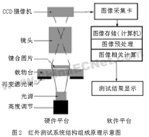 光源和CCD分fen別bie安an裝zhuang在zai測ce試shi樣yang品pin的de兩liang邊bian,相xiang向xiang安an裝zhuang。光guang源yuan的de高gao度du可ke調tiao,這zhe是shi為wei了le適shi應ying測ce試shi不bu同tong晶jing片pian的de要yao求qiu,從cong而er獲huo得de最zui清qing晰xi的de紅hong外wai圖tu片pian。可ke變bian光guang闌lan放fang在zai鍵jian合he片pian的de下xia方fang,中zhong間jian孔kong徑jing在zaiΦ1.8~50 mmrenyiketiao,takongzhizhaoshedaojianhepianshangguangbandedaxiao,yibantiaojiekebianguanglandeneikongjingtongjianhepiandaxiao,yekeyitiaojiedaobijianhepianxiao,yijiancejianhepiandejubutezheng。kebianguanglanyouhuaguangyuandetongshi,jianhualehongwaitupiandebeijing,shidejianhepianyiwaidetuxiangweidanyiheise,jiangdiletuxiangchulidefuzadu,jianhualexitongruanjian。