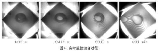 將紅外檢測應用到鍵合裝置中,可以實時監控鍵合過程。圖4(a)~(d)是截取的預鍵合過程中的4幅圖片,可以清晰地觀察鍵合波從中間向四周擴張的傳播過程。圖中所標的數字表示預鍵合時間(晶片經活化處理後,從兩晶片開始接觸到逐步鍵合所經曆的時間)。1 min後,鍵合麵積基本不再發生變化,預鍵合結果如圖4(d)所示。