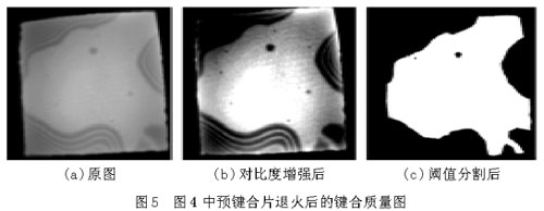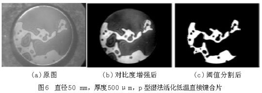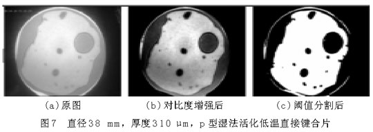 圖6(a)和圖7(a)中,圓形區域是要鍵合的圓片,其中明區為鍵合上的地方,暗區為未鍵合上的地方,圓形區域(即鍵合圓片)以外為圖像背景。從圖上可以大致地看出空洞(未鍵合區域)的分布、個數和大小等。為了獲得更為準確的數據信息,借助圖像處理程序對圖片(a)進行對比度增強、平滑、分割等一係列處理,可獲得圖(b),(c),從而得到鍵合率。樣品1的鍵合率為28.12%,鍵合率很低,並且從圖6中空洞的分布可以看出,樣品1鍵合得很不好。樣品2的鍵合率為66.12%。比較圖6和圖7,樣品2的鍵合質量明顯優於樣品1,可ke以yi說shuo明ming鍵jian合he圓yuan片pian越yue薄bo,越yue容rong易yi鍵jian合he。可ke以yi從cong平ping板ban理li論lun理li解jie這zhe一yi鍵jian合he現xian象xiang,圓yuan片pian越yue薄bo,界jie麵mian表biao麵mian能neng克ke服fu圓yuan片pian翹qiao曲qu貼tie合he到dao一yi起qi所suo需xu要yao的de力li越yue小xiao。