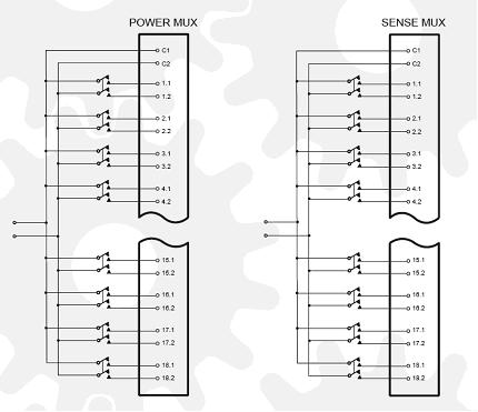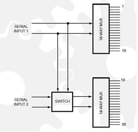 所有的模塊都可以配置成18路的設備。40-735模塊可以配置成兩個18路的多路複用器,從而兩個手機可以由分離的串行接口同時進行控製。40-568電源和傳感模塊多路複用器可以配置為一個18路的設備,進行電源和傳感線路的轉換,兩個這樣的模塊就可以排列成兩個18路的,或是一個單獨的36路多路複用器。