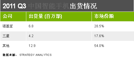 Strategy Analytics的報告顯示,今年第三季度,諾基亞仍然是中國智能手機市場的龍頭,市場份額為28%。宏達電緊隨其後,市場份額為24%。蘋果位居第三,市場份額為20.6%。