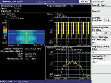 政府規定要求控製發射信號的功率、頻率、daikuan。zhexieguidingfangzhiyouhaiganraobingbaozhengmeigefashezhedoushipindaineiqitayonghudeyouhaolinju。duiyuxuduopinpufenxiyitebieshitongchangyongyumaichongxinhaonengliangceliangdesaopinpinpufenxiyi,jinxingcileiceliangshijuyoutiaozhanxingde。RTSA 能neng夠gou分fen析xi一yi個ge完wan整zheng的de分fen組zu發fa射she過guo程cheng的de能neng量liang特te點dian,也ye能neng直zhi接jie測ce量liang跳tiao頻pin信xin號hao的de載zai波bo頻pin率lv,而er無wu需xu將jiang信xin號hao置zhi於yu一yi個ge跨kua度du的de中zhong心xin。按an一yi下xia按an鍵jian,分fen析xi儀yi就jiu能neng識shi別bie一yi個ge瞬shun時shi RFID 信號的調製方式並能夠對功率、頻率和帶寬進行監管測量,使預一致性(pre-compliance)測試過程變得非常靈活和方便 [參閱圖2]。預一致性測試有助於確保產品一次通過一致性測試,而無需重新設計和重新測試。