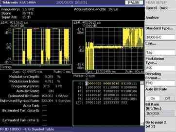 RTSA 也能解調與標簽查詢相關的符號或比特。用戶隻需選擇相應的 RFID 標準、調(tiao)製(zhi)類(lei)型(xing)和(he)解(jie)碼(ma)格(ge)式(shi)。分(fen)析(xi)儀(yi)能(neng)自(zi)動(dong)檢(jian)測(ce)並(bing)顯(xian)示(shi)鏈(lian)路(lu)的(de)比(bi)特(te)率(lv)。為(wei)進(jin)一(yi)步(bu)提(ti)高(gao)工(gong)程(cheng)師(shi)的(de)生(sheng)產(chan)效(xiao)率(lv),對(dui)恢(hui)複(fu)出(chu)的(de)數(shu)據(ju)符(fu)號(hao)進(jin)行(xing)了(le)基(ji)於(yu)功(gong)能(neng)的(de)顏(yan)色(se)編(bian)碼(ma)(color-coded)。RTSA 能夠自動識別前導符並將那些符號染成黃色。這易於識別實際的數據負荷並與已知值進行比較。