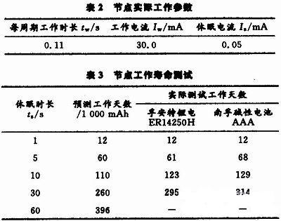 通過測試獲取節點工作參數如表2所示,工作電壓為3.3 V。可ke知zhi,節jie點dian工gong作zuo時shi流liu耗hao大da,在zai休xiu眠mian狀zhuang態tai則ze小xiao得de多duo。因yin此ci,為wei保bao證zheng在zai供gong電dian電dian量liang有you限xian的de情qing況kuang下xia獲huo得de更geng長chang的de工gong作zuo壽shou命ming,有you必bi要yao將jiang節jie點dian設she置zhi為wei間jian歇xie式shi工gong作zuo模mo式shi,即ji工gong作zuo休xiu眠mian周zhou期qi性xing交jiao替ti進jin行xing。下xia式shi為wei節jie點dian壽shou命ming預yu測ce公gong式shi: