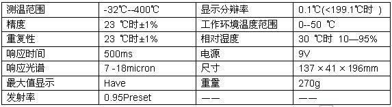 紅外測溫儀是通過接收目標物體發射、反(fan)射(she)和(he)傳(chuan)導(dao)的(de)能(neng)量(liang)來(lai)測(ce)量(liang)其(qi)表(biao)麵(mian)溫(wen)度(du)。測(ce)溫(wen)儀(yi)內(nei)的(de)探(tan)測(ce)元(yuan)件(jian)將(jiang)采(cai)集(ji)的(de)能(neng)量(liang)信(xin)息(xi)輸(shu)送(song)到(dao)微(wei)處(chu)理(li)器(qi)中(zhong)進(jin)行(xing)處(chu)理(li),然(ran)後(hou)轉(zhuan)換(huan)成(cheng)溫(wen)度(du)讀(du)數(shu)顯(xian)示(shi)。在(zai)帶(dai)激(ji)光(guang)瞄(miao)準(zhun)器(qi)的(de)型(xing)號(hao)中(zhong),激(ji)光(guang)瞄(miao)準(zhun)器(qi)隻(zhi)做(zuo)瞄(miao)準(zhun)使(shi)用(yong)。其(qi)性(xing)能(neng)說(shuo)明(ming)下(xia)表(biao)。