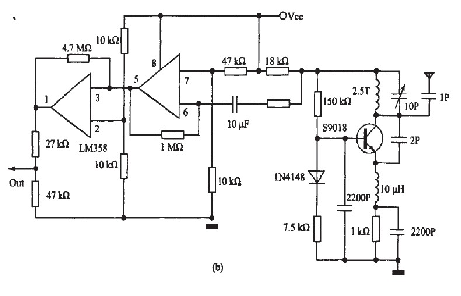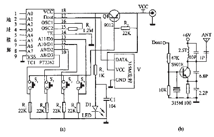 該部分電路主要由315MHz無線數據發射模塊和編碼集成PT2262組成。該無線發射模塊原理圖如圖1中(b)所示,它具有較寬的工作電壓範圍3-12V,當電壓變化時發射頻率基本不變,和發射模塊配套的接收模塊無需任何調整就能穩定地接收。當發射電壓為3V時,空曠地傳輸距離約20-50m,發射功率較小;當電壓5V時約100-200m)當電壓9V時約300-500m;當發射電壓為12V時,為最佳工作電壓,具有較好的發射效果,發射電流約60毫安,空曠地傳輸距離700-800m,發射功率約500mW.當電壓大於12V時功耗增大,有效發射功率不再明顯提高。發射模塊采用ASK方式調製,以降低功耗。當數據信號停止時發射電流降為零,數據信號與DF發射模塊輸入端可以用電阻或者直接連接而不能用電容耦合,否則DF發射模塊將不能正常工作。數據電平應接近DF數據模塊的實際工作電壓,以獲得較高的調製效果。