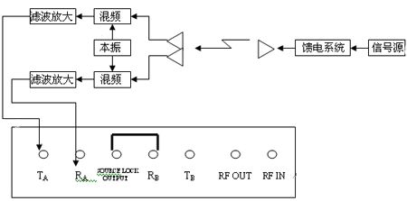 信號源輸出頻率為f1的信號,經天線陣列饋電係統後由天線輻射出去,兩個接收天線的接收信號經混頻變為頻率為f2的信號,再經濾波放大後分別饋入3630A的TA、、RA端。