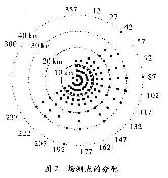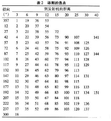 覆蓋測試是根據特定的半徑和幅角在圓周上進行選點的,這些測試點的選擇總共包含18個不同幅角(12,27,42,58,72,87,102,117,132,147,162,177,182,207,222,287,300,357),對應於以發射機為圓心的3,6,9,12,15,20,25,30和40 km這幾個半徑上。選點是出於幅角的考慮,展現了至少45 dBμV/m內的場強估計,並根據地形信息通過算法得到有用信息。圖2展示了場測選點的地形分配,測試點的具體參數,如表2所示。