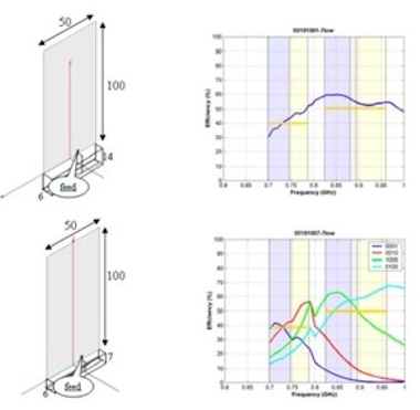 下麵這個例子很好地說明了調諧方法在天線體積減小方麵帶來的好處。這裏用3D電磁建模程序分析兩種不同的天線配置:一種是寬帶設計;另一種是可以在相同頻率範圍內調諧,但使用了4個調諧狀態的窄帶設計。