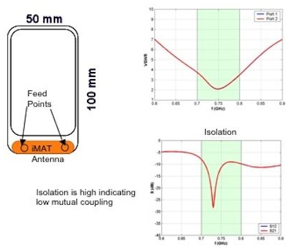 還有一種可行的解決方案,使用SkyCross公司提供的隔離模式天線技術(iMAT),從相同的天線結構產生兩種不同的模式。iMAT天線結構放置在手機的一端;兩(liang)個(ge)饋(kui)點(dian)分(fen)別(bie)運(yun)行(xing)不(bu)同(tong)的(de)輻(fu)射(she)模(mo)式(shi)。這(zhe)兩(liang)個(ge)饋(kui)點(dian)是(shi)相(xiang)互(hu)隔(ge)離(li)的(de),不(bu)會(hui)發(fa)生(sheng)互(hu)耦(ou)導(dao)致(zhi)的(de)損(sun)耗(hao),因(yin)此(ci)每(mei)種(zhong)模(mo)式(shi)的(de)效(xiao)率(lv)都(dou)很(hen)高(gao)。另(ling)外(wai),輻(fu)射(she)圖(tu)案(an)是(shi)不(bu)同(tong)的(de),因(yin)此(ci)會(hui)產(chan)生(sheng)一(yi)個(ge)較(jiao)低(di)的(de)相(xiang)關(guan)係(xi)數(shu)。圖(tu)4描述了iMAT天線的實現原理,從圖中可以看到,在相同天線結構上的兩個饋點之間的隔離。